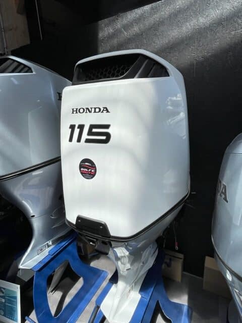 Moteur HONDA BF115 LRU arbre long de couleur blanc.